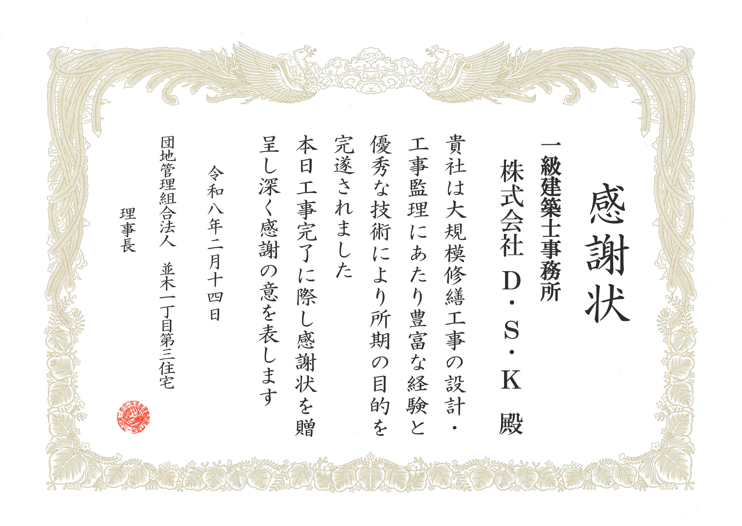 令和8年2月大規模修繕工事竣工 管理組合様より感謝状を贈呈されました。