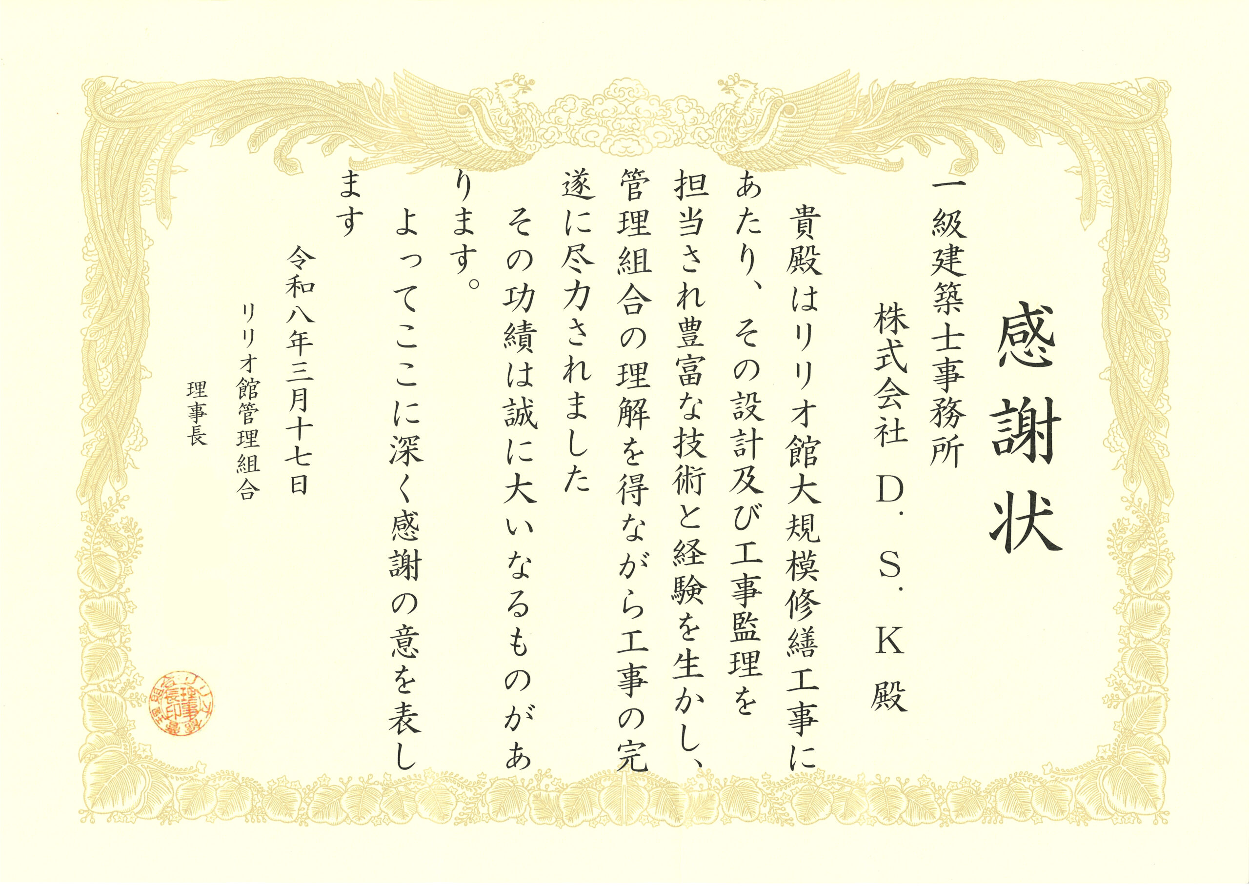 令和8年2月大規模修繕工事竣工 管理組合様より感謝状を贈呈されました。