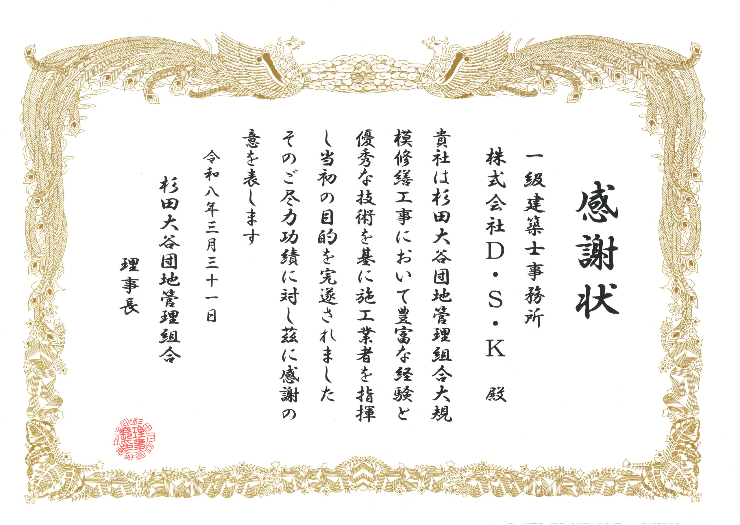 令和8年3月大規模修繕工事竣工 管理組合様より感謝状を贈呈されました。