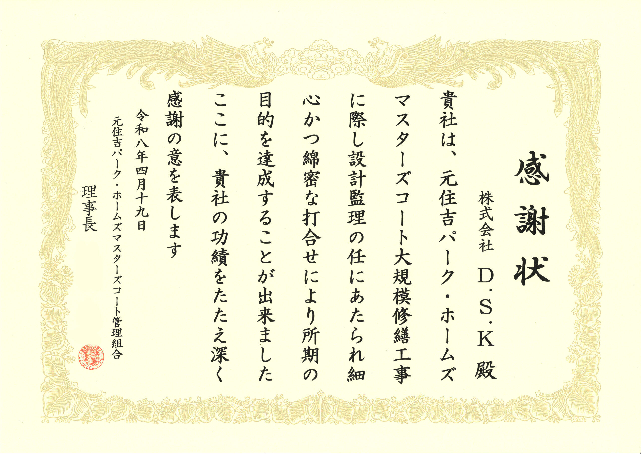 令和8年4月大規模修繕工事竣工 管理組合様より感謝状を贈呈されました。